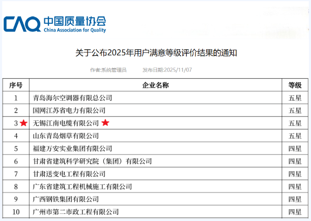 江南電纜憑借在電纜領(lǐng)域多年深耕積累的過硬技術(shù)實(shí)力與穩(wěn)定產(chǎn)品品質(zhì),與青島海爾、國網(wǎng)江蘇電力等公司,共6家企業(yè)成功獲評“用戶滿意五星級” 稱號。